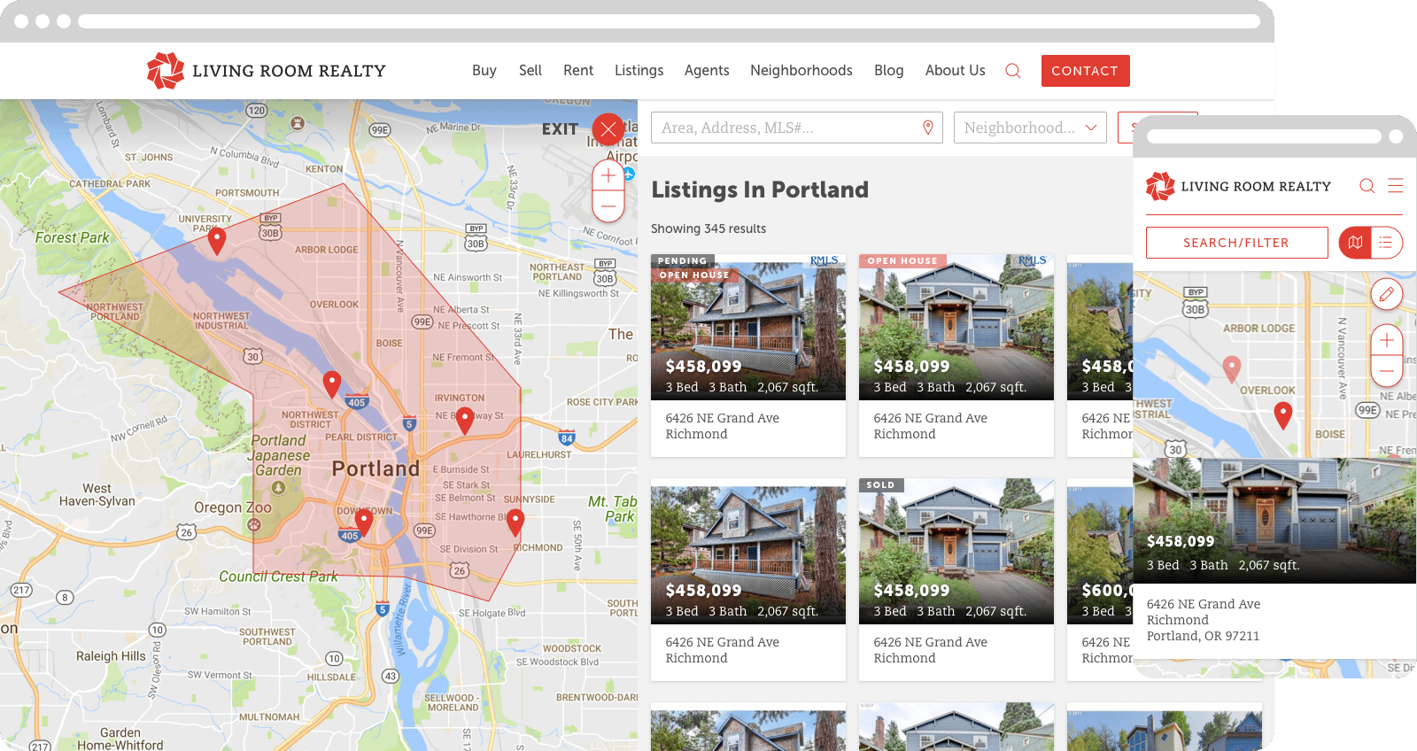 At the core of the website is a custom React based search application which pulls updated listing information directly from Living Room Realty’s MLS provider: RMLS.